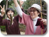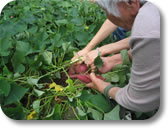 | 中庭の畑にさつまいもがたくさんできました。みんなでいも掘り、えい、やっと。 |