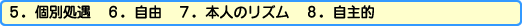 | 家庭に家風はありますが、規則はありません。部屋で過ごすのが好きな人、皆と一緒の方が楽しくいられる人様々です。又、朝寝、昼寝をする人、日中は活動的に動く人、それぞれの過ごし方に合わせてスタッフは対応していきます。やりたい事、得意な事も入居者各自違います。テレビを見るのが好きな人、後かたづけの上手な人、それぞれ個人のやりたい事、得意な事を大切にした支援を行います。又、逆にやりたくない気持ちを大切にすることも、大切な支援の一つです。 |