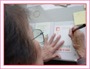 どうも乗り気ではないようです。 「ちょうど今からハガキ買って来るところやけど、ついでに買っとこうか?」 「ほう!ならついでに買っといてもらうわ」 それきた!やっぱりそうなんだ。書きたい気持ちが伝わりました。ハガキを渡して様子を伺いました。今ひとつの表情。 「私も今から書き物があるから良かったら一緒に書く?」 ぱっと私の目を見て 「いいの?なら一緒に書くわ」 2人机に並んで書き始めました。 「ところで何するんやったっけ?」と笑うTちゃん。 「年賀状の返事よ」 「あ〜そうそう」 思い出してくれました。 「で、どこに何書けばいい?」 何をどうしたらいいのかわからない様子です。 「ここにこの郵便番号を書くといいよ」 書く場所、書く番号を指差しました。 「あぁ、ありがとう」 スラスラ書かれました。 「これでいいんかいね?」 確かめの言葉です。不安なのでしょう。 「いいよ。」という言葉を聞くと笑顔を見せてくれました。 「で、次教えてくれる?」 住所、宛名と一つ一つ順番に伝えるととても綺麗な文字で書かれました。 アショカの住所はスタンプを押しました。