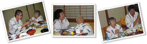 そんなこんなで夕方前にホテルに到着。まずは最大の目的でもある温泉に家族風呂を借りてNさんは男性チームと、Yさんは女性チームでそれぞれ入浴。当初の予定では湯けむり混浴ツアーのはずだったのだが・・・残念! さっぱりした後はみんなで夕食です。普段はお目にかかれないご馳走にNさんもYさんもいつもより箸がすすんでいます。Nさんは大好きな冷酒を一杯やりながら、6人の会話ははずみ、いつもはあまり話さないYさんも今日は饒舌で昔話に花が咲いた楽しい日でした。