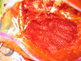 | キムチの素を白菜にぬっていきます(クライマックス)。白菜の間に大根やニラを混ぜてもおしい。 |