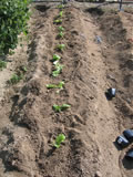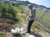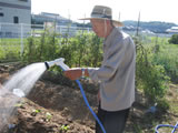 苗植えです。軍手をつけてKさんのやる気は十分です。鍬を持って耕していく作業では、まだ足元に不安があったため、ドキドキしながらでした。一つひとつ丁寧に苗を植えて肥料を蒔き、最後は水やりで終了です。