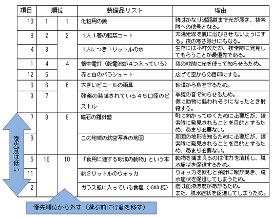アメリカでの出来事です。あなたを含めて4人が搭乗した軽飛行機が、事故を起こしてしまいました。不時着したのは、アリゾナ砂漠の真っ只中。最寄の町まで歩いて110kmのところです。幸い、機内には12の装備品がありました。使用するための優先順位を決めて、全員が無事に生還するための方法を考えて下さい。