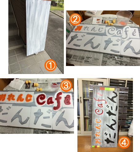 開店するにあたり、部屋作り、看板、テーブルなどの準備をすべてスタッフたちの手作りで行いました。先ずは看板、ホームセンターでボードやペンキやら買ってきまして(@、A、B、C)、