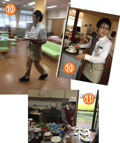 | ウェイターは練習通り、てきぱきと動けています(I)。 裏方もケーキの盛り付け、美味しいコーヒーをたててと頑張っています(J)。 |