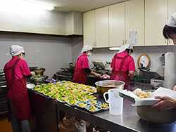 お昼の厨房ではビハーラ1階の分、2階の分、ルンビニーの分、お弁当を一気につくりあげます。