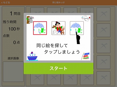 最初は出てくる絵の枚数も少なく、比較的簡単に2枚を選ぶことが出来るのですが、問題が進んでくると出現する絵の枚数も増えてきて、同じ2枚を選び出すことが徐々に難しくなってきます。