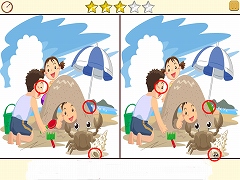 定番の間違い探しですが、複数の人と一緒にすると盛り上がります。「我先に探してやろう!」という意欲を持つことが大切で、結果言えなくても、「探してやろう」と2つの絵とにらめっこすることが大切です。 |