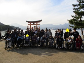 最初は「無理だろうな・・・・」と不安に思いながら、徐々に計画を進めていき、普段の業務をこなしながらの計画作成、スタッフとの思いのぶつかり合いに、投げ出しそうになりながらも少しずつ形になっていき、来る12月3日、広島県は安芸市の宮島に行く日がやってきました。参加者総勢30名!貸し切りバスには全員乗り切らず、また、住人様の体調を考慮し、ルンビニーから一台車を出し、2台で出発することに。 |