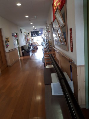 雨どいとホースを使って玄関から裏口まで全長約28メートルの長さがあります。たぶん介護施設で日本一の長さじゃないかと自負しています(笑)。準備の時には傾斜を考えながら雨どいを微調整していきます。ウォーターサーバーの大ボトルや本を使って途中で止まらないこととそうめんも取りやすい傾斜をセッティングする様はもう職人芸です。