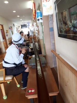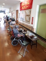 住人さんも逃さないようにお箸を構え準備します。上手にすくえると笑顔になり「ズルズル〜」っと勢いよくすすっていきます。「美味しいね。」「やっぱり暑い日はそうめんが美味しいね。」といろんなところで声が上がります。器の中にはそうめんがいっぱい溜まっている住人さんもおり「食べるよりも取るほうがおもしろいわい。」と山盛りになった器を見せてくれました。「あんたの分も取ってあげる。」と私の器にも山盛りのそうめんを入れて下さいました。最近、食が細くなっている住人さんもいつもと違う雰囲気に大盛り召し上がられていました。
