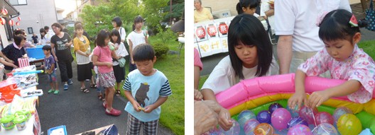 ヨーヨー釣りをしたり、かき氷を食べたりして夏祭りを楽しみます。