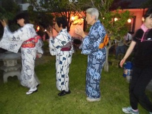 職員とご家族に協力して頂き、浴衣に着替えた入居者さん達が中庭に出てきて