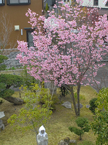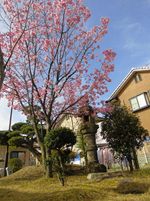 何本かある桜の中で一足先に鮮やかなピンク色を付ける桜があります。それが「陽光」という種類の桜です。今年も色鮮やかなピンク色の花を咲かせています。