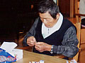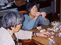幼稚園のみんなへのお土産に鶴を作りました。みんなで折って、糸でつなげて。
