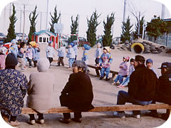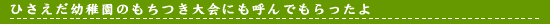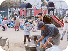 ひさえだ幼稚園のもちつき大会にも呼んでいただきました。Mさんは杵を持って、園児たちと一緒にぺったんぺったん。女性陣はつきあがったお餅にあんこを入れて丸めます。つきたてのお餅はおいしい!