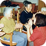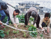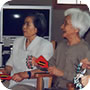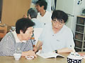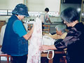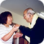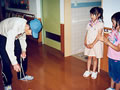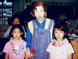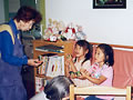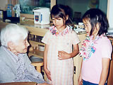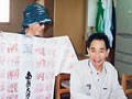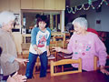 小学生のかわいいお客さん。 「おじいちゃんやおばあちゃんで、昔の遊びのできる人はいませんか?」 学校の宿題とのこと。早速、こま回し、けん玉、お手玉など披露しました。 鶴の首飾りもプレゼントしました。