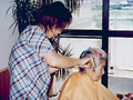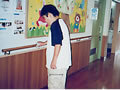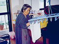 朝はご飯の後片付けやらいろいろ大忙し。洗濯物干しもたいへんだわ。 乾いたものはわしらがたたんでみようわい。
