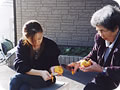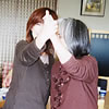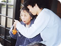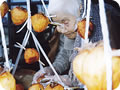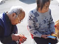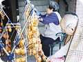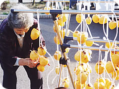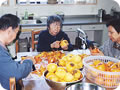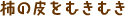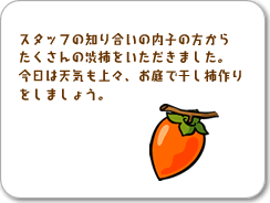 去年に引き続き、今年も干し柿作りをしました。スタッフの知り合いの方からいただいたたくさんの渋柿のまずは皮むきです。天気の良い暖かい日にはお庭で、部屋の中でも・・・皮むきは続きます。干してしばらくするとやわらかくなってきました。やわらかくなったところで柿がもっと、もっとやわらかくなるように、今度は柿もみです。