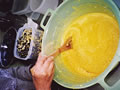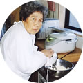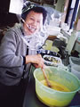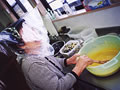 からし漬けを作っています。目が痛いものでナイロンをかぶって失礼!! あはははは。