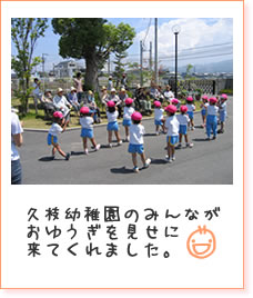 近所の久枝幼稚園の園児たちが、おゆうぎを見せにやって来てくれました。みんな一生懸命おどってくれて、とても上手でした。入居者のみなさんも子供たちのかわいらしさにニコニコでした。