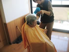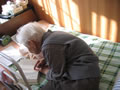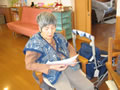 子どもたちが学校農園で稲刈りをしています。ベランダからその様子をながめています。