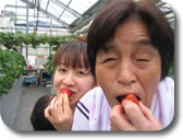 いちご狩りで大きないちごを採っては、食べ。採っては、食べ。
